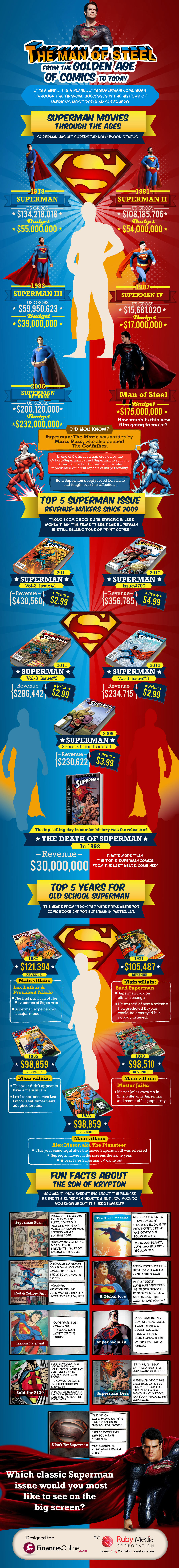 Με αφορμή την προσεχή κυκλοφορία του “Man of Steel” και την συμπλήρωση 75 χρόνων απο την κυκλοφορία του πρώτου comic του “Superman” (Action Comics #1 – 1938), το website FinancesOnline.com δημιούργησε ένα χάρτη (Infographic) με τα οικονομικά κατορθώματα του σούπερ-ήρωα, τόσο στίς εκδόσεις όσο και στη μεγάλη οθόνη.